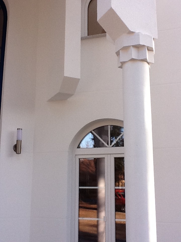 Schöneiche: Neubau eines spirituellen Gebäudes. Im Eingangsbereich wurde Säulen im orientalischen Stil hergestellt. Als Grundmaterial kam glatt geschalter Beton zum Einsatz. Die Oberfläche, zweimal geschliffen und gespachtelt, wirkt apart. Die Ausbildung der Säulenköpfe erfolgte aus Styropor mit Anpassung vor Ort. Schließlich erhielten die Säulen eine Oberflächenveredlung mit einem Glattputz. |